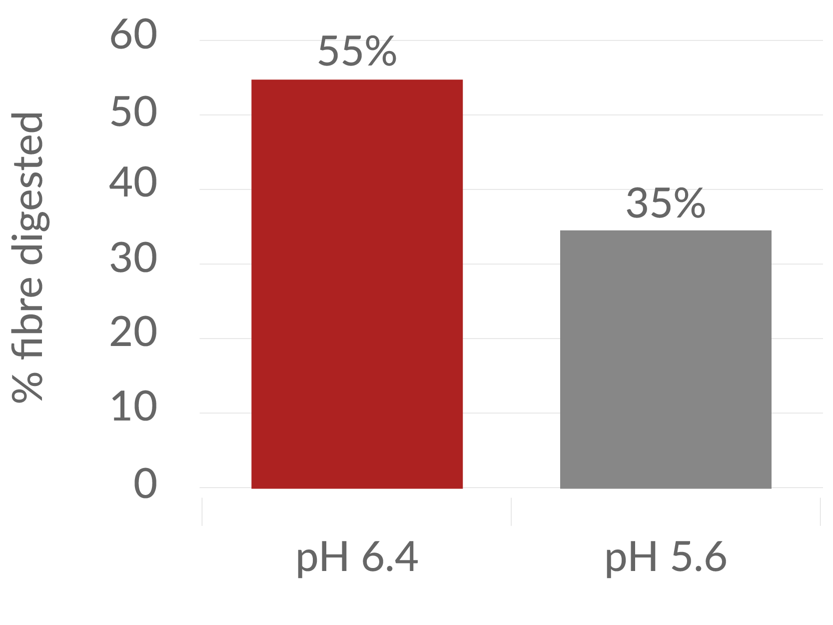 With less fibre in the diet, saliva production also declines, further weakening the cow’s natural acid-buffering system. Once pH dips below 6.0, fibre digestibility drops sharply, energy supply falls, and the cycle can escalate into sub-acute rumen acidosis (SARA).